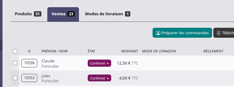 Ce mode est accessible en sélectionnant des commandes à l'état CONFIRMÉ sur la page des ventes ou bien depuis vos boutiques en ligne lorsque les prises de commandes sont terminées :