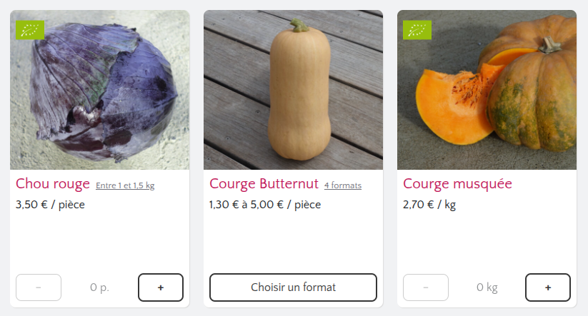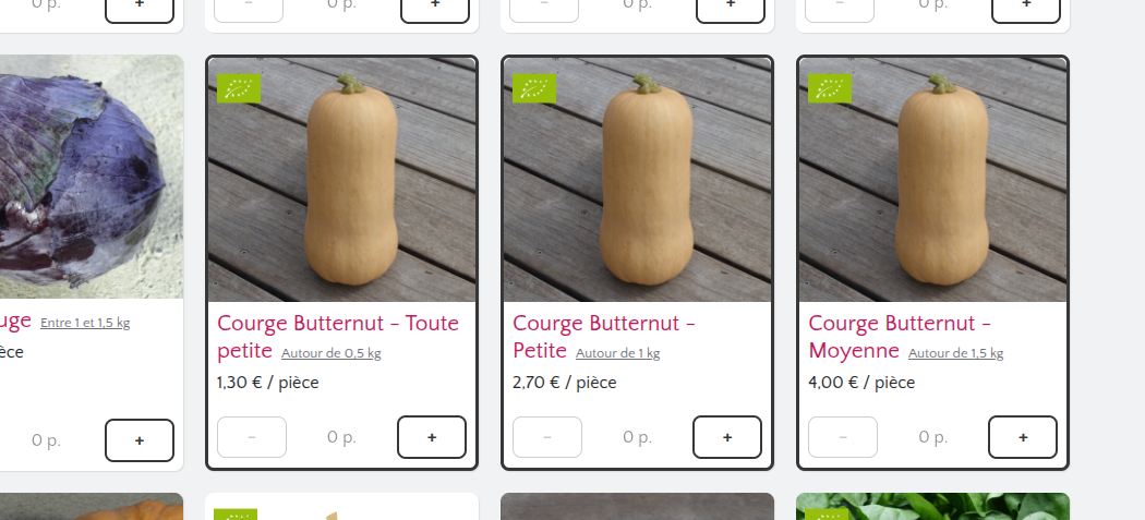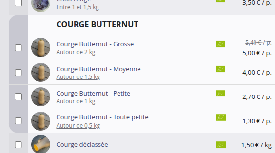 Lorsque vous vendez des produits très similaires, vous voulez peut-être les regrouper pour éviter d'avoir une liste de produits à rallonge, et permettre à vos clients de choisir le format qui les intéresse le plus. Par exemple dans le cas où vous vendriez des courges de différentes tailles.