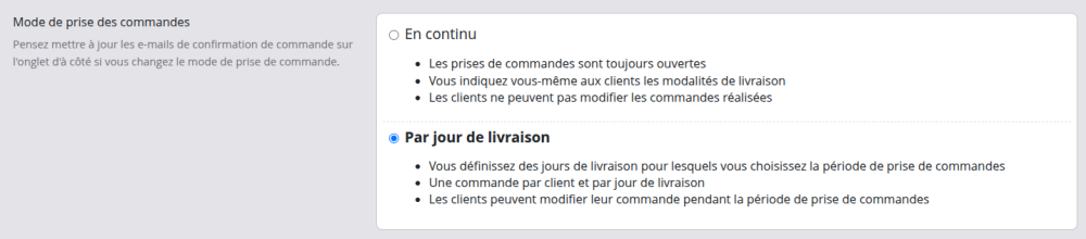 Lorsque vous choisissez d'autoriser les prises de commande en continu, vous n'avez plus à configurer de nouvelles livraisons. Vos clients commandent quand ils veulent dans la semaine, et c'est à vous de les informer des modalités de livraison.