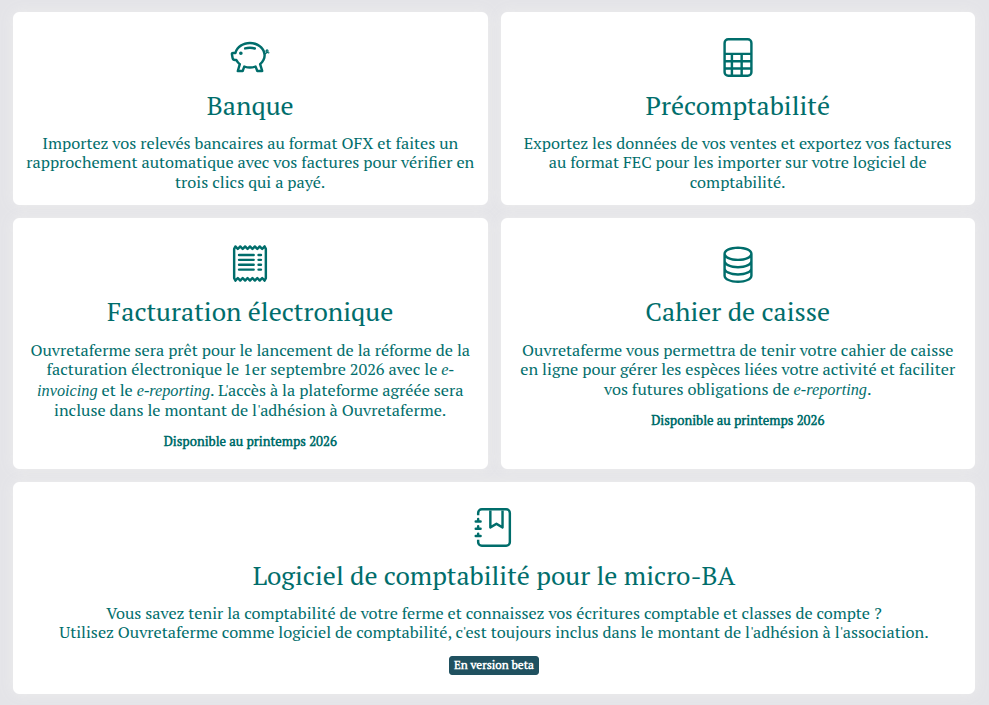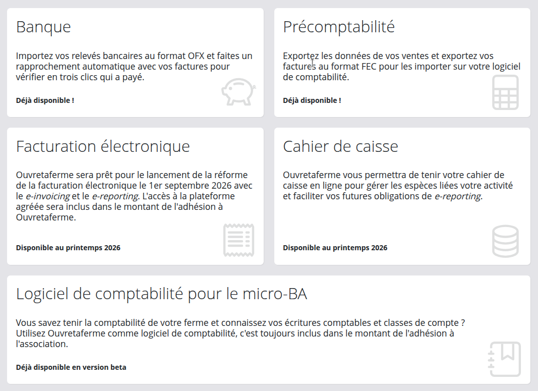 Les fonctionnalités de rapprochement bancaire et la précomptabilité sont d'ores et déjà pleinement fonctionnelles. Nous allons travailler sur la facturation électronique et le cahier de caisse pendant la première moitié de 2026 pour être prêts pour le lancement de la réforme. Notre objectif est que ces fonctionnalités vous permettent à terme de réaliser une tenue de la comptabilité de votre ferme conforme, intuitive et simple.