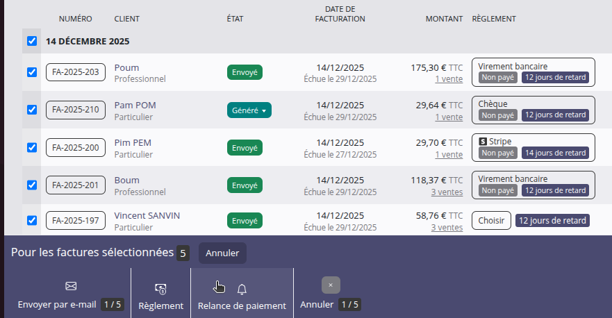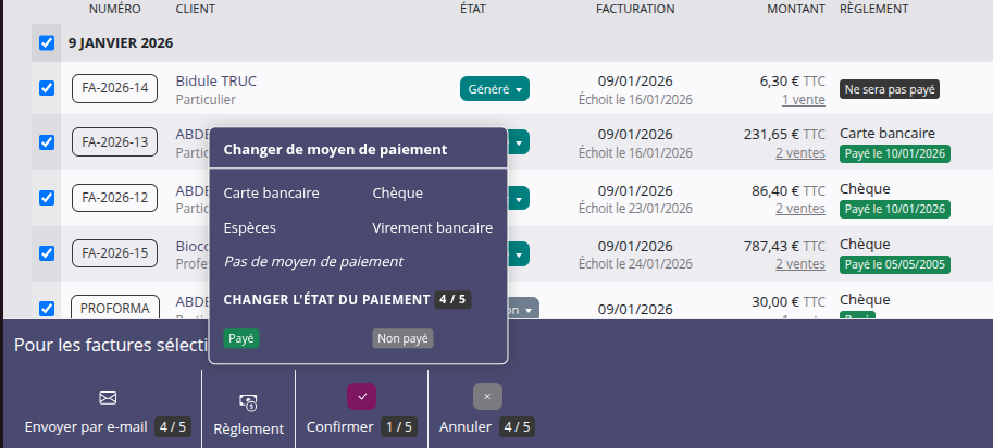 Vous pouvez désormais changer le moyen de paiement ou l'état de paiement des factures en masse.