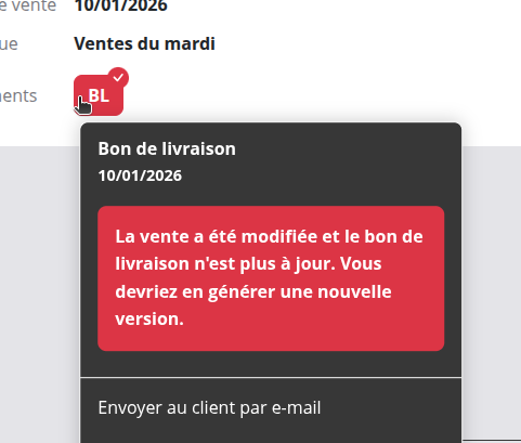 • Le système vous met désormais une alerte si un bon de livraison ou un devis ne correspond plus au contenu de la vente (cela signifie dans ce cas que vous devez sûrement régénérer ces documents !)