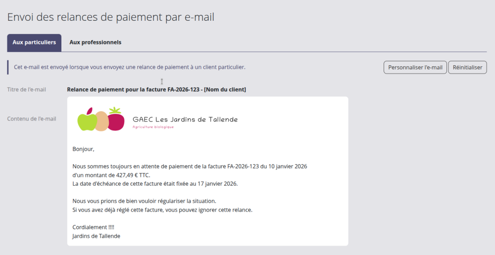 L'e-mail de relance est également personnalisable dans le paramétrage des factures :