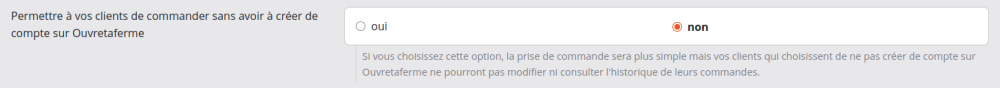 Nous avons ajouté une option qui vous permet d'autoriser vos clients à passer commande sur vos boutiques en ligne sans avoir à créer de compte client sur Ouvretaferme ! Elle s'active depuis le paramétrage de la boutique.