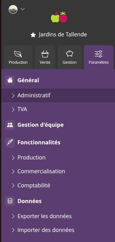 Le paramétrage des fonctionnalités de Ouvretaferme est désormais centralisé dans un menu dédié. Il était auparavant dispersé dans plusieurs menus.